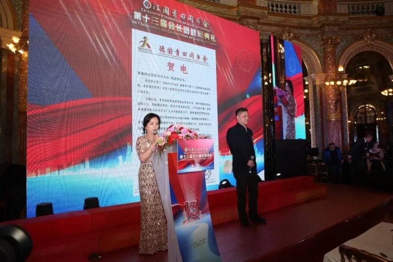 法国青田同乡会第一常务副会长王献伟、妇女主任包雪玲在现场宣读贺电。