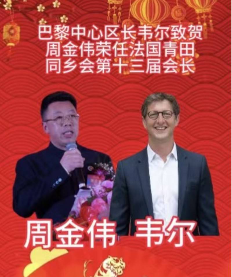 今晚我虽然无法亲临现场,但我谨向周金伟先生表示最热烈的祝贺,祝贺他荣任法国青田同乡会第十三届会长。多年来,周先生一直致力于非凡的公益事业,尤其在关爱无家可归者方面,他无私奉献、默默付出,从不计较个人时间。我作为巴黎市中心区区长,特此向他致以诚挚的祝贺,并在此强调法中合作的重要性,因为良好的法中合作关系对我们意义重大。正如大家所知,在巴黎,我们有一处承载法中文化交流的重要场所——潘玉良广场。最后,再次向法国青田同乡会第十三届会长周金伟先生表示衷心的祝贺。