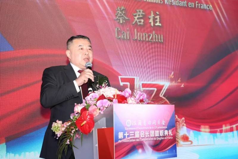 蔡君柱在致辞中表示,法国青田同乡会是旅法侨界具有重要影响力的侨团之一。多年来,同乡会在历届会长的带领下始终团结乡亲、服务侨胞,积极参与侨社建设,热心支持公益事业,为促进侨界和谐发展、推动中法民间交流做出了积极贡献,也赢得了社会各界的广泛赞誉。青田素有“华侨之乡”的美誉。无数青田儿女怀着敢闯敢拼的精神走向世界,在海外辛勤创业、扎根发展,为当地经济社会建设作出贡献,也成为连接祖国与世界的重要桥梁。旅法青田乡亲更是法国华侨华人群体中的重要力量,为侨社繁荣发展注入了源源不断的活力。作为生活在法国的华侨华人,我们既是中华文化的传播者,也是中法友谊的民间使者。希望法国青田同乡会在周金伟会长的带领下,继续弘扬团结互助的优良传统,凝聚侨心、汇聚侨力,在促进侨社发展、推动中法交流合作方面发挥更大的作用。