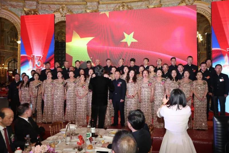 法国青田同乡会第十三届会长周金伟带领协会合唱团在现场演唱歌曲《歌唱祖国》。