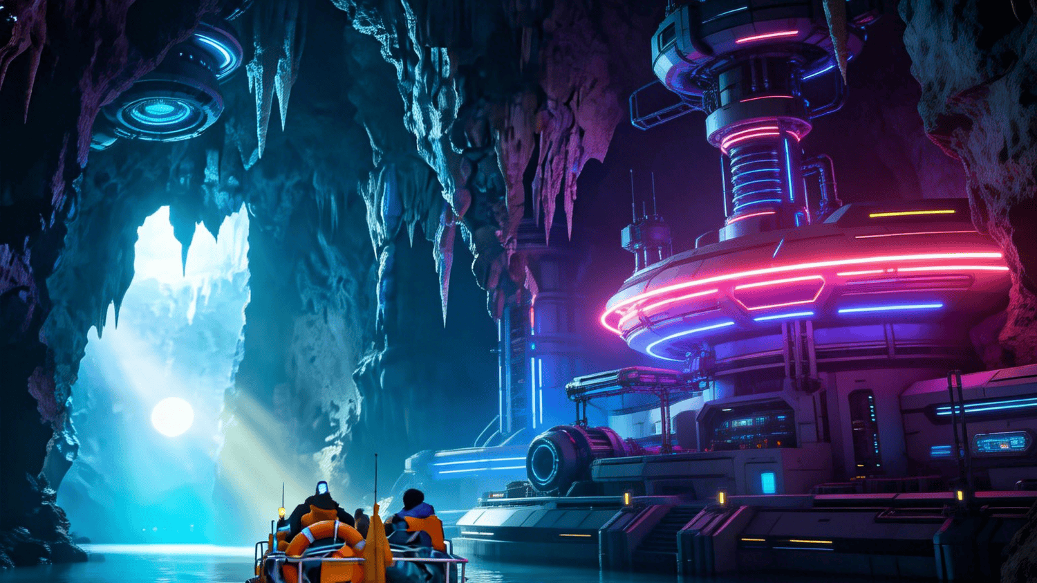 2、科幻秘境: 构想未来溶洞的样貌。如赛博朋克风格的灯光装置、外星基地、机械与钟乳石共生的奇异景象。